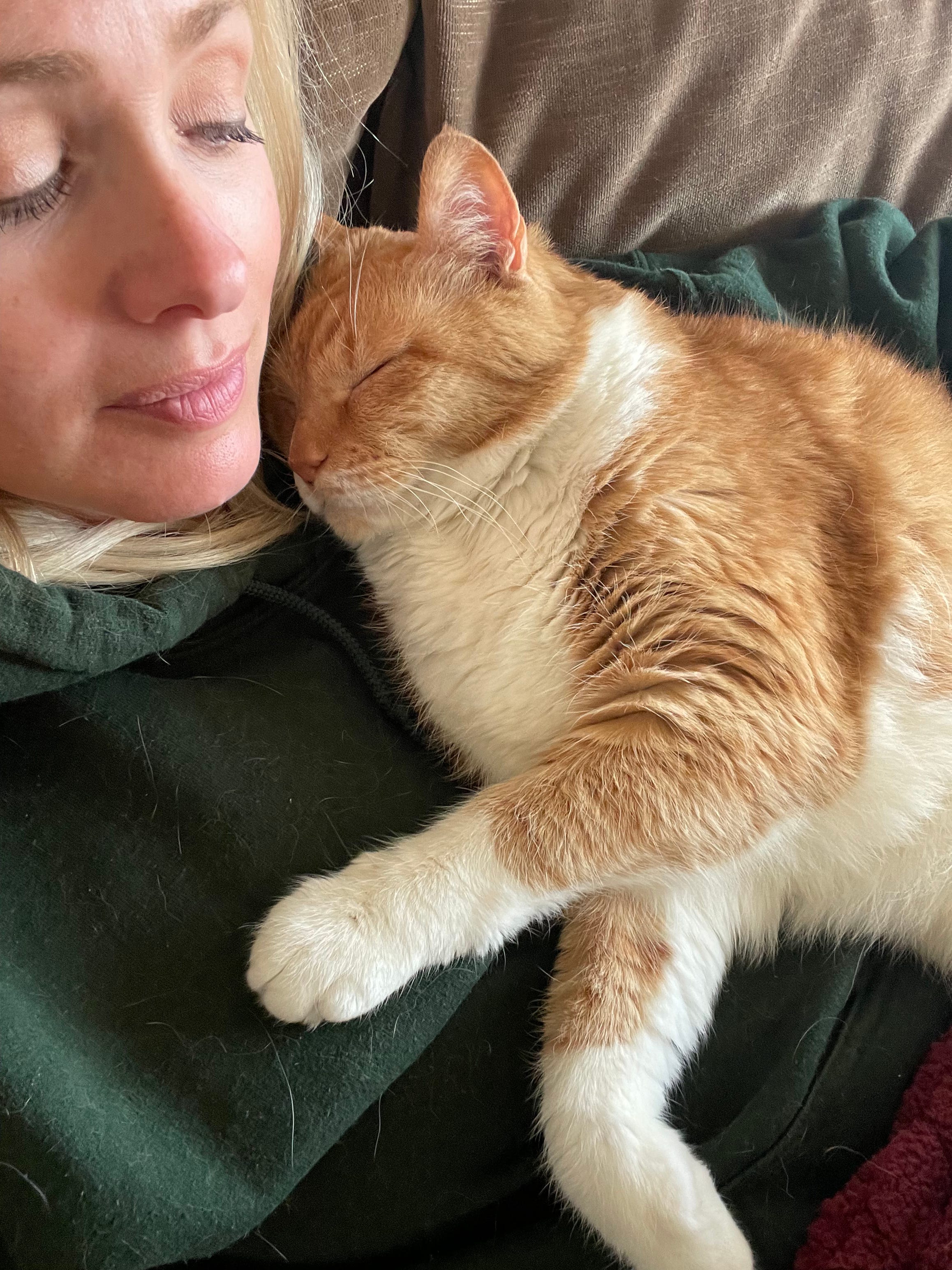 My orange cat is Morris. My neighborhood in Jamestown has a multitude of cats outdoors and I had started putting food out on the back porch for them. Not a lot because other neighbors do the same but enough so they know it's a safe place. In late 2023, I saw this orange cat who always looked so sad and I started leaving out more. He was timid and if he even saw me watching him, he took off. In late summer 2024, he started trusting me and over time let me pet him. One of my cats sometimes came to the door and they got along and when another stray staked her claim to my backyard with a litter of kittens, I decided to bring Morris in. It hasn't been perfect. 14 months later, the cat who got along with him at the door still has issues with him and his survival instincts aren't the best but the sad orange cat who wanted nothing to do with me is home and the biggest cuddler of my 3 cats.